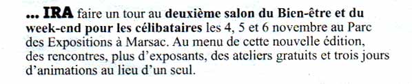 La revue BIO CONTACT ( Octobre 2011 - tirage 259 000 exemplaires ) diffuse l'info dans son agenda.